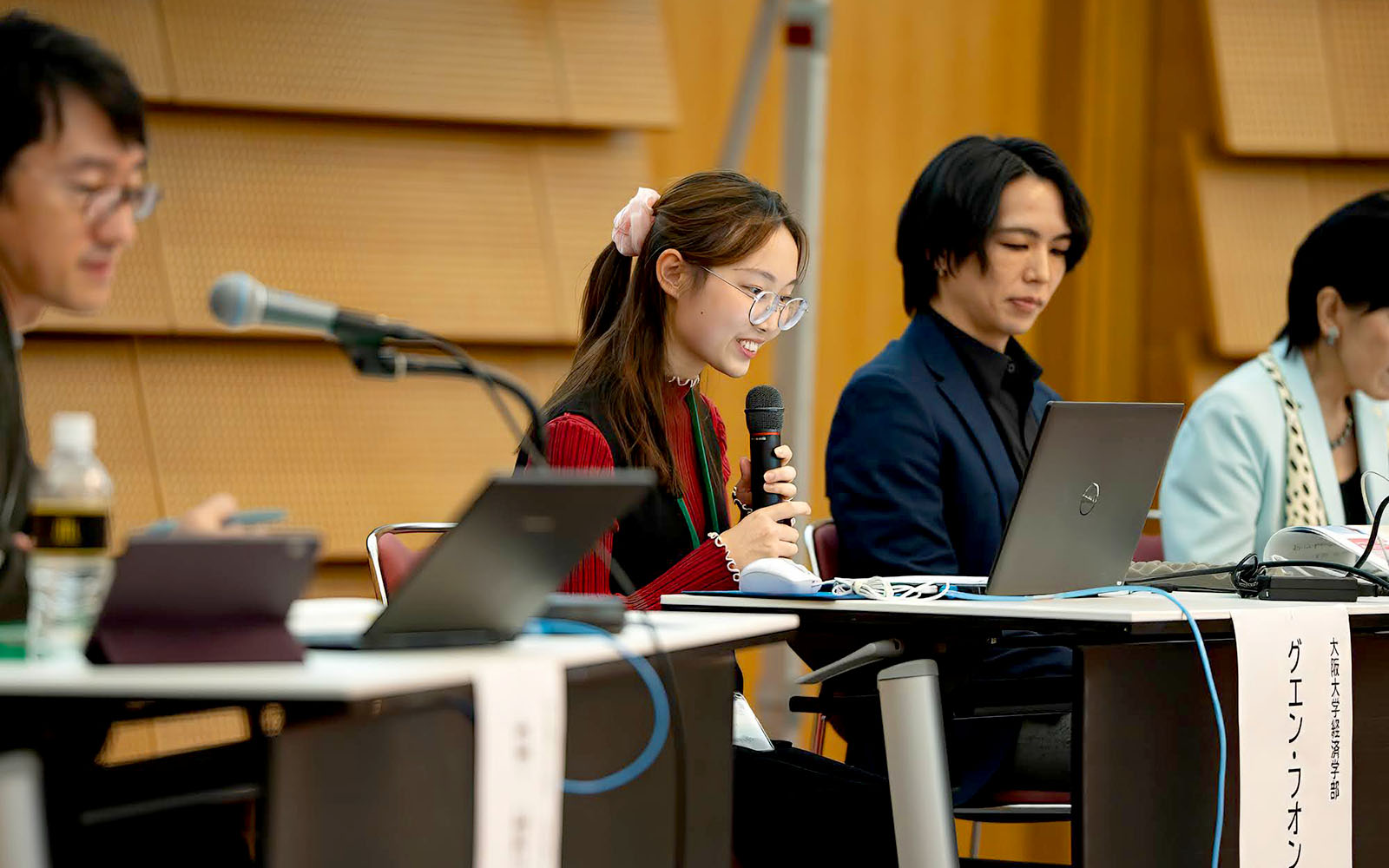 第2部のパネルディスカッションでは、株式会社パソナグループの青田 朱実 氏、楽天グループ株式会社の川那 賀一 氏、大阪大学の堂目 卓生 社会ソリューションイニシアティブ長、大阪大学経済学部のグエン・フオン・リーさんをパネリストとし、「社会課題を『自分ごと』にする教育と実践」について、参加者からの質問・コメントを交えながら、活発な意見交換を行いました。